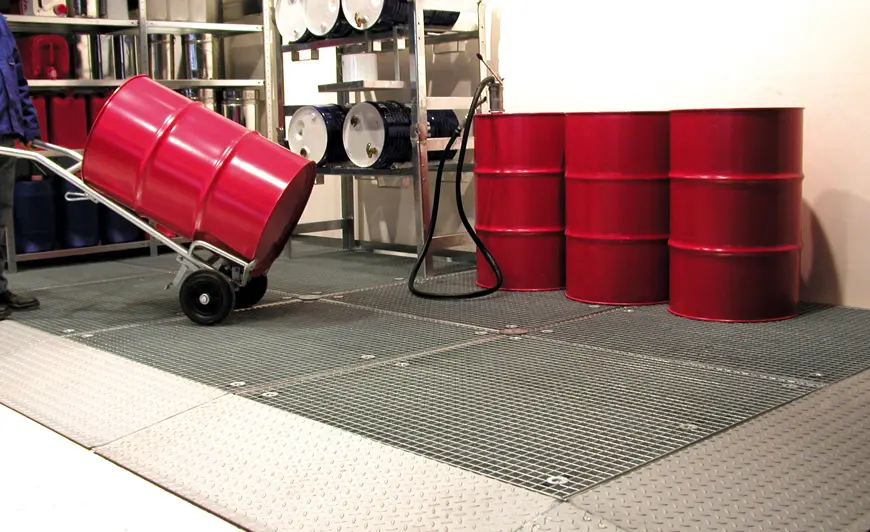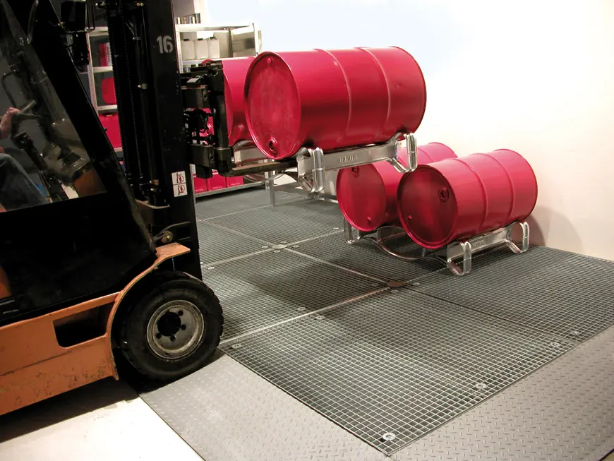 Los entarimados colectores están formados por un conjunto de cubetos de retención de baja altura que unidos entre sí y fijados al pavimento permiten crear zonas muy amplias de almacenamiento de líquidos peligrosos. Fabricados en sistema modular forman espacios seguros para el almacenamiento y el transvase de sustancias líquidas, inflamables, agresivas o contaminantes como aceites, ácidos, bases, disolventes, etc...
