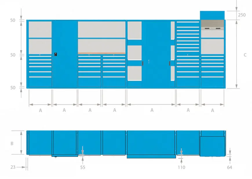 Todo el conjunto, o módulos por separado, se pueden cerrar con paredes traseras y/o laterales. También pueden incorporarse cerramientos frontales para proteger los elementos almacenados. Puertas batientes con cerradura, puertas correderas o de persiana de longitud total o parcial.