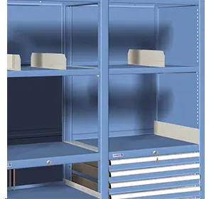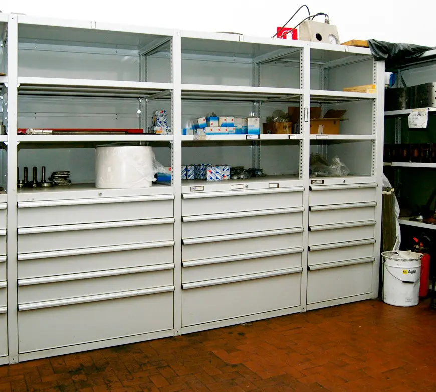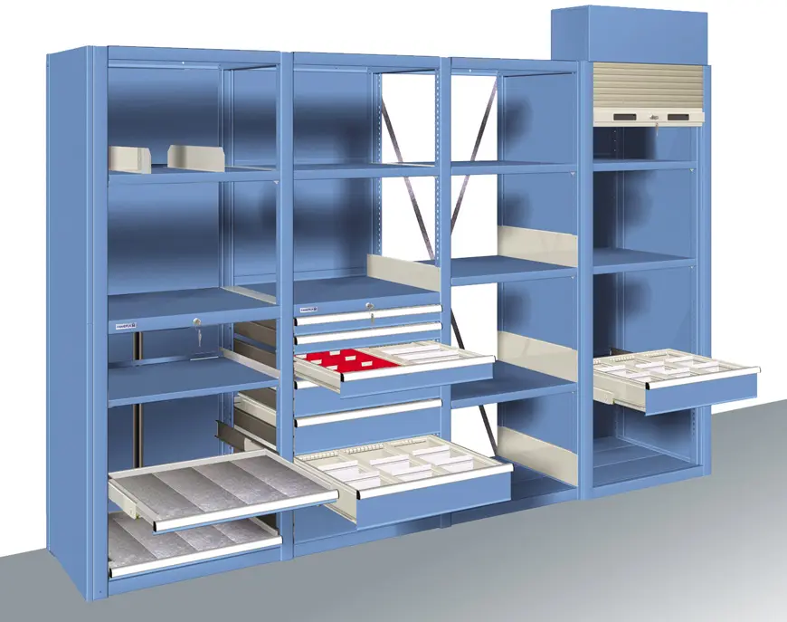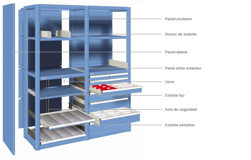 Sistema modular de cajones y estantes dispuestos en estantería que permite realizar zonas de almacenamiento a medida. Gracias a la versatilidad de sus componentes y a la gran variedad de material de subdivisión consigue optimizar costes y espacio. La estructura, los estantes y los cajones de las estanterías están diseñados para soportar cargas considerables y resolver un gran abanico de problemas de almacenaje, aprovechando de un modo racional todo el espacio disponible. Muy adecuadas para un uso intensivo en talleres, fábricas y recambios.
