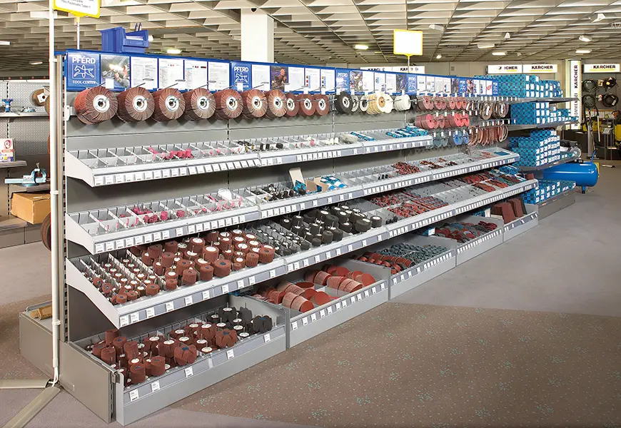 Disponemos de un sistema de diseño rápido y eficaz. Esto nos ayuda en gran medida a la hora de planificar y distribuir los espacios de almacenamiento y la manera en la que se muestra el producto. Tenemos configurados un gran número de módulos ya definidos, así como accesorios complementarios para crear exactamente la zona de exposición en función del producto a almacenar.