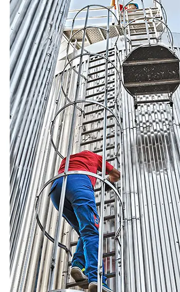 Hemos suministrado un sistema adaptado de escaleras fijas y pasarelas que permitan acceder a los techos de los silos desde diferentes lados y el paso sencillo y seguro de unos silos de fermentación a otros. La planificación ha tenido en cuenta plenamente la estática y la capacidad de carga de los techos con previa consulta con el fabricante de los silos y depósitos contratado.