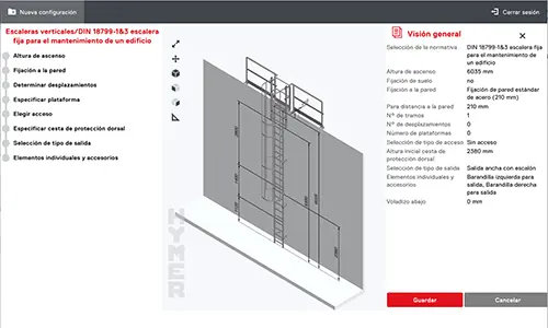 Disponemos de configurador on-line que le prestará una gran ayuda previa. Con ella podrá definir y configurar fácil y rápidamente una escalera vertical fija. Evidentemente con verificación automática de la conformidad con la normativa vigente, un esquema acotado 3D, listas de piezas y las instrucciones de montaje.